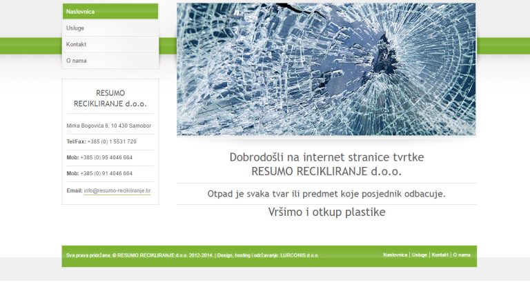 Tvrtka RESUMO RECIKLIRANJE d.o.o. bavi se gospodarenjem otpadom na području cijele Republike Hrvatske i specijalizirani smo za sve vrste otpadnog stakla u staklarskoj industriji, automobilskoj industriji, građevinarstvu, komunalnim staklenim otpadom, staklenim otpadom iz postrojenja za obradu otpada i svim ostalim gospodarskim granama vezanim za staklo i staklarstvo.